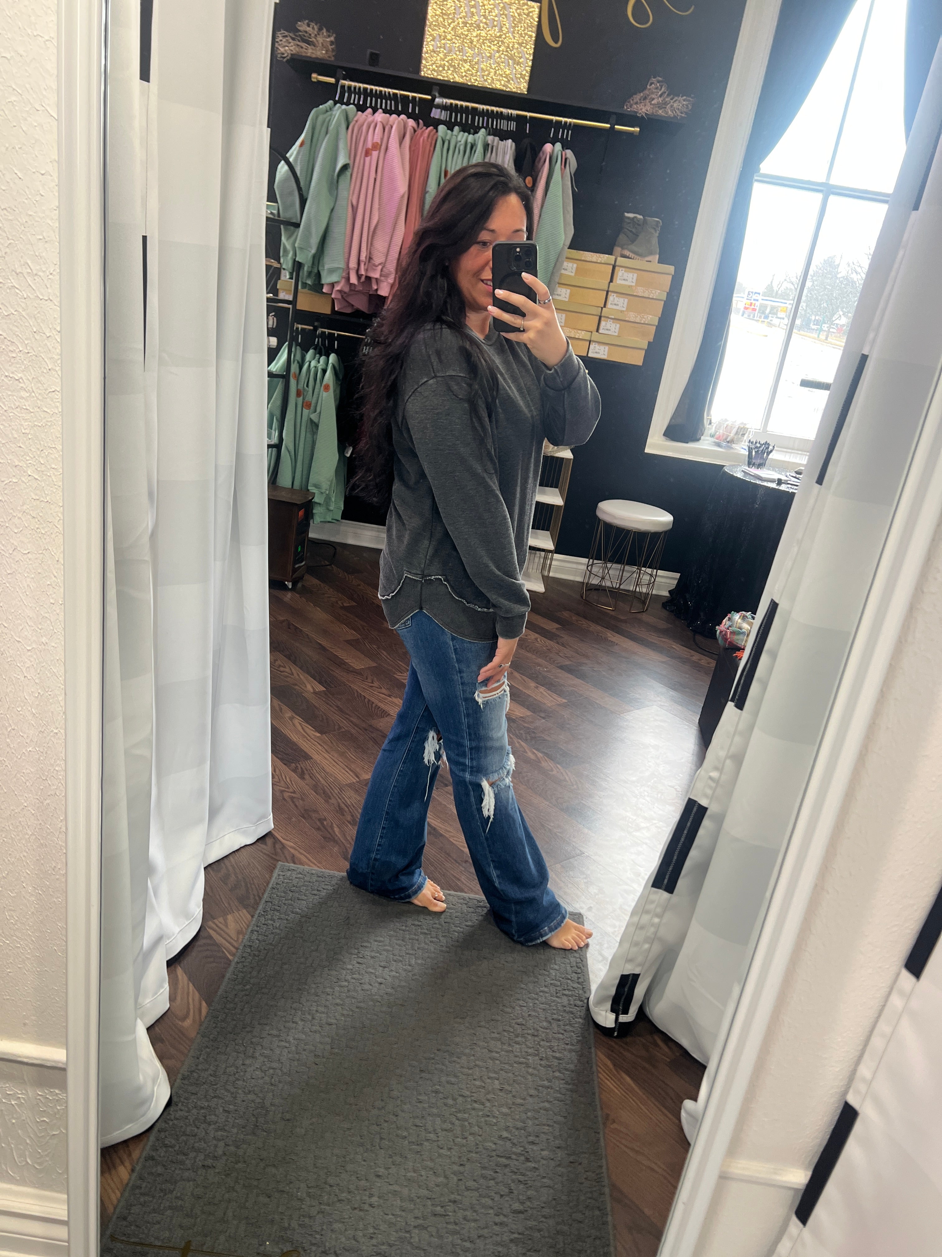 Wear comfort and style together with this Vintage Wash pullover. It has a classic crew neck design with a vintage wash and feminine detailing for a unique touch. Cozy and stylish, it's a must-have for your wardrobe. The rounded, split hem is so flattering! Great to wear with jeans or leggings!
