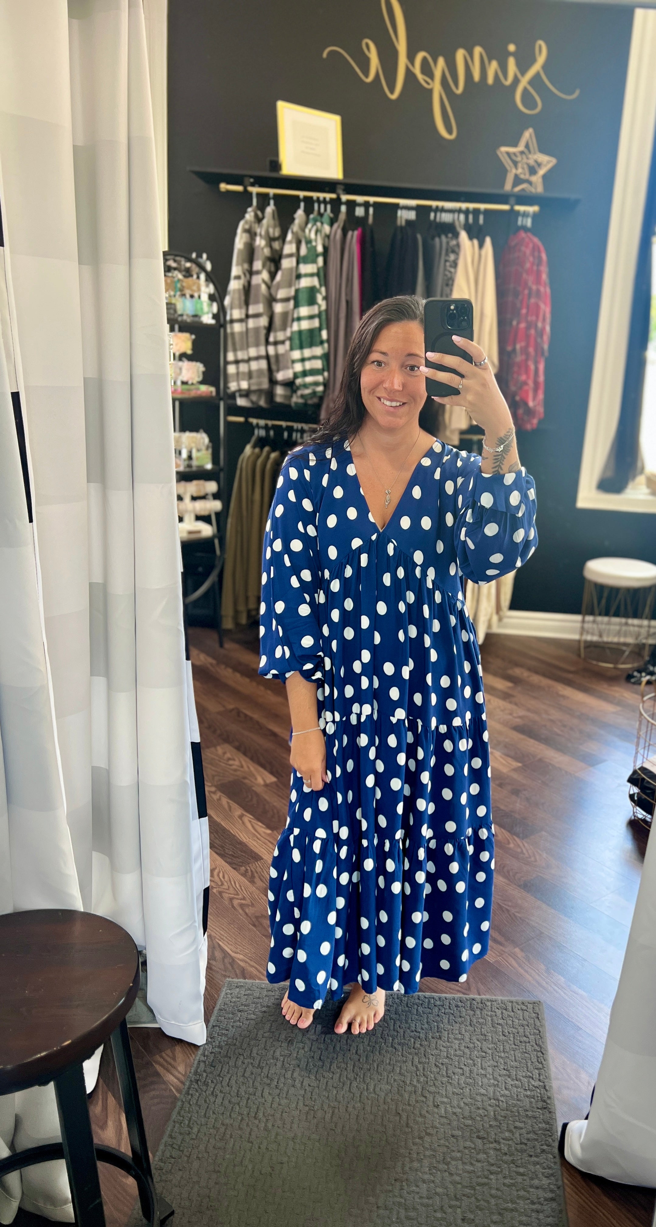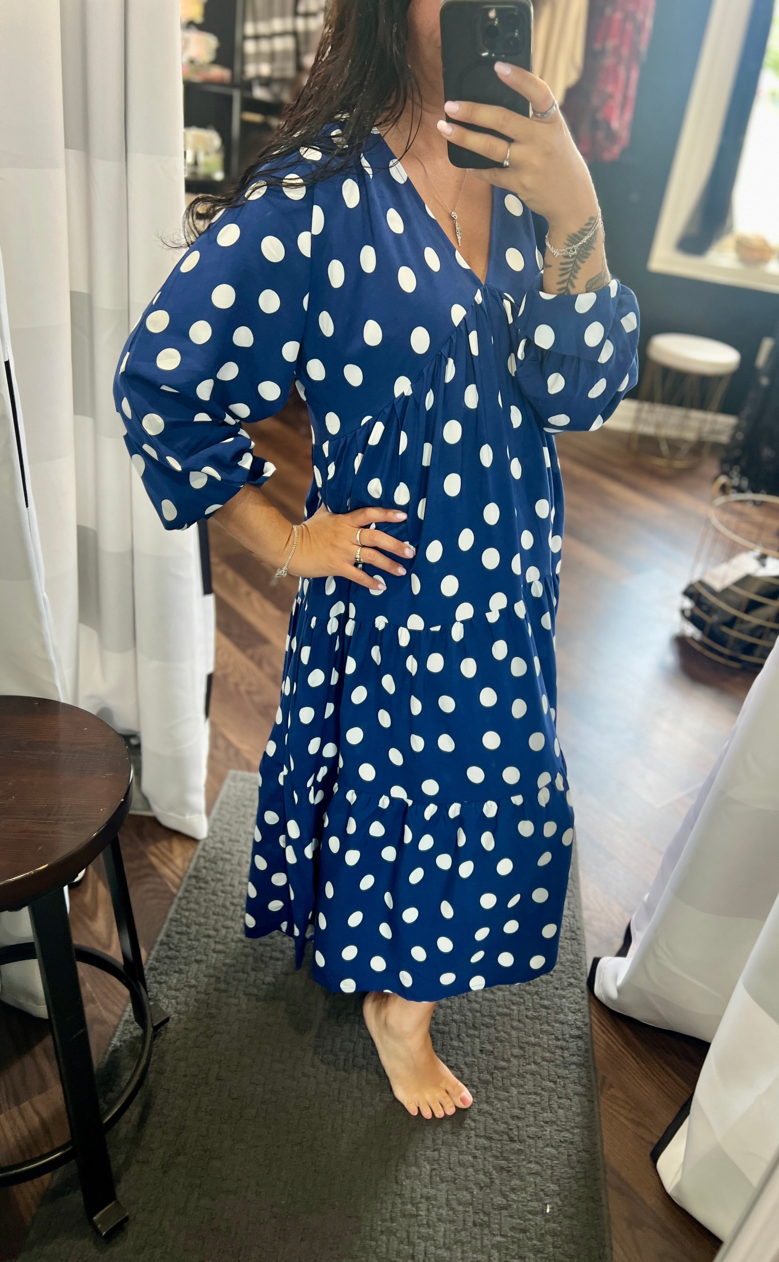 Introducing the Randi Polka Dot Dress, a lightweight tiered polka dot dress that features a v-neck, balloon sleeves with button cuffs, and flowy tiers for comfort and easy to move in. Pair with cute sandals, wedges or boots! This piece can go from work to date night.