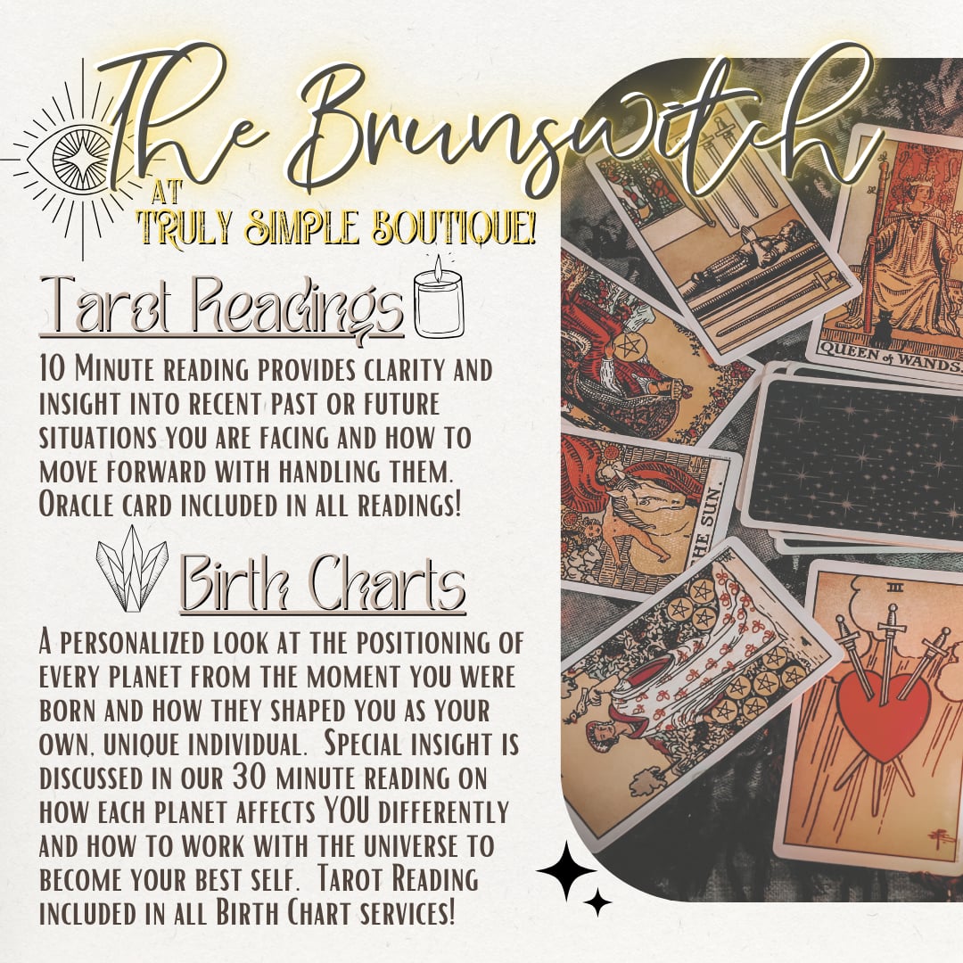 Kinsley is an incredible human who brings so much good energy into Truly Simple, every time she comes to visit! She provides tarot readings and astrological readings, birth charts. Now I know... I was super skeptical but I've had multiple tarot readings done and they were SPOT ON! I know other people that have been read by Kinsley, and they have all said their tarot readings have been spot on as well!