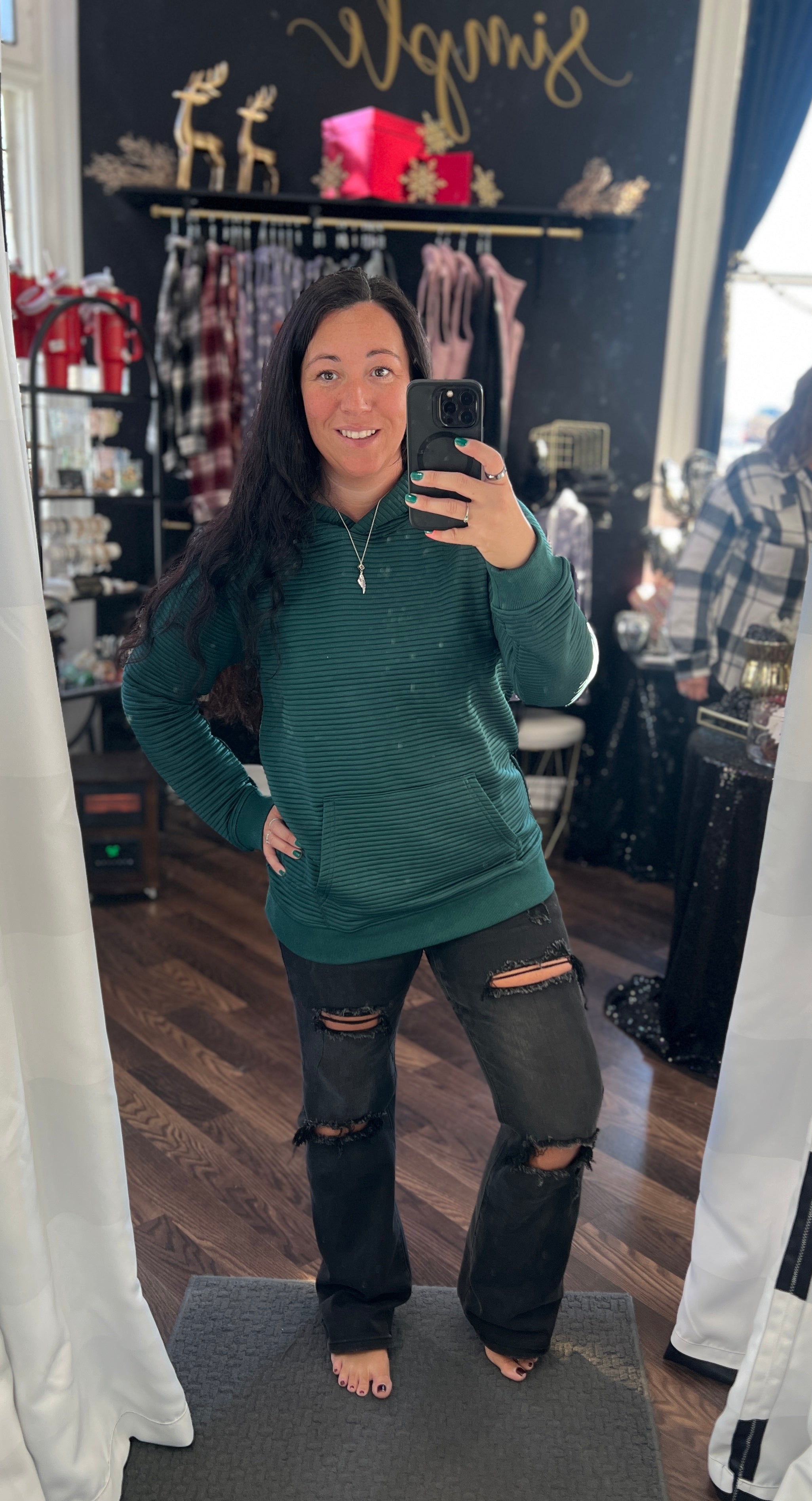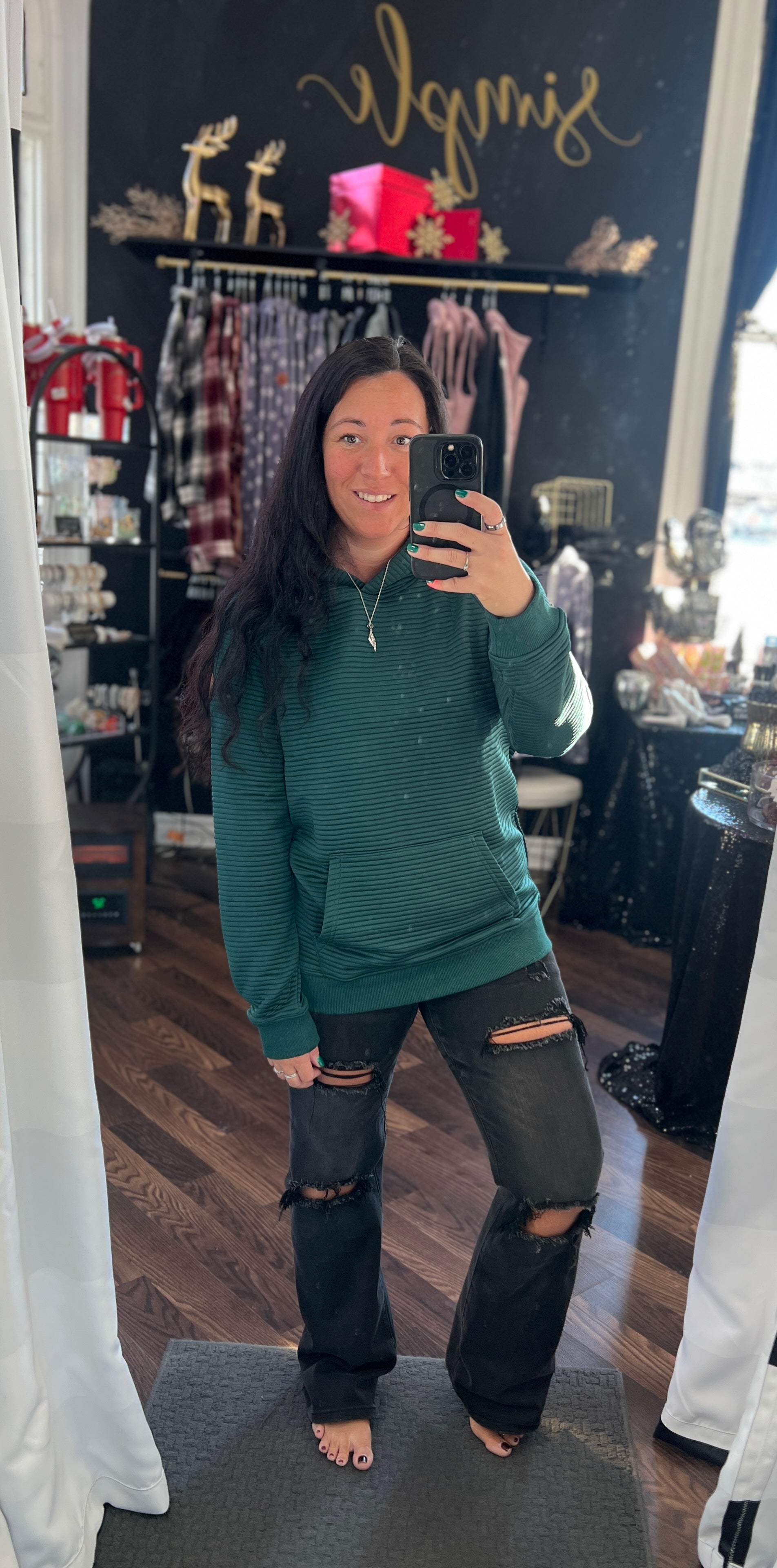 Remember the Teal Tatum hoodie from the last winter?!? Stay cozy and stylish with our Hunter Green Tatum Textured Pullover Hoodie, this color is absolutely gorgeous. The perfect addition to your wardrobe, this hoodie features a kangaroo pocket for convenience and a fun pullover design.