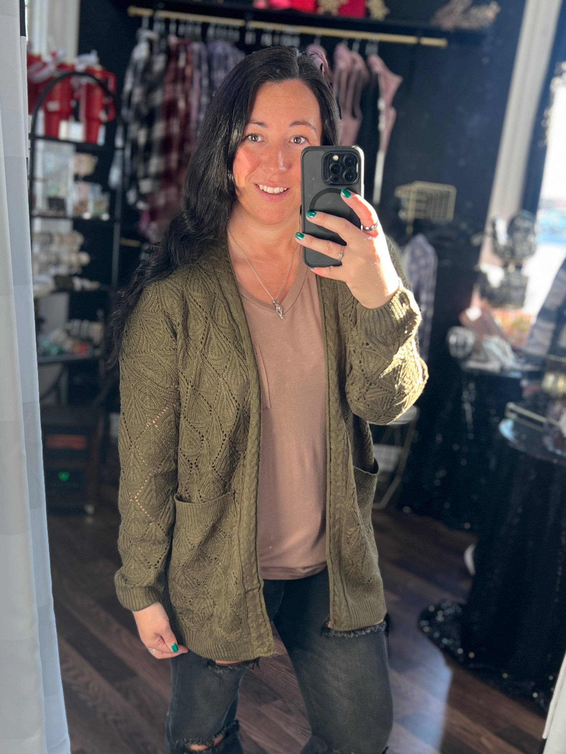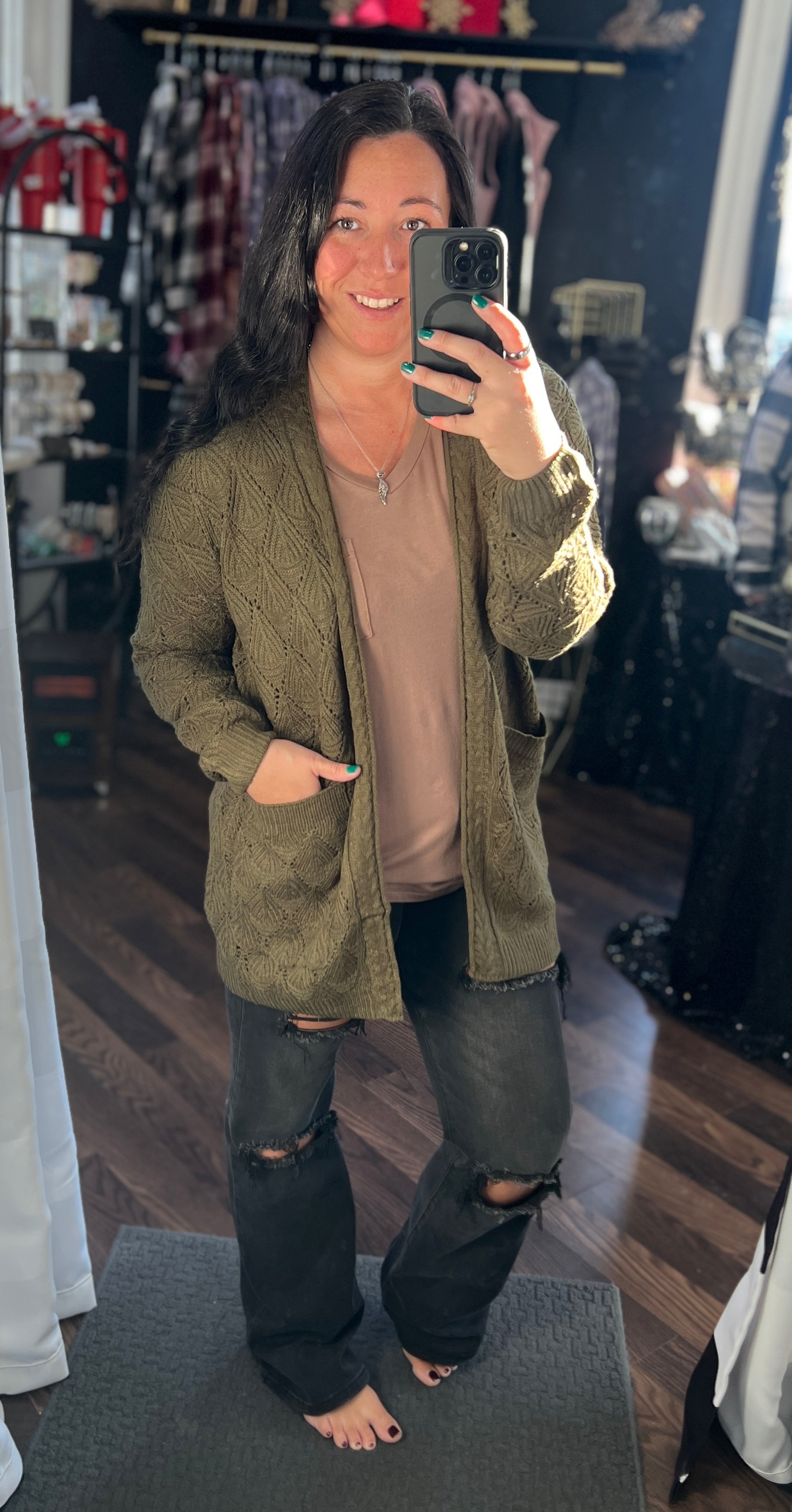 We love versatile pieces and here is our newest launch! Lightweight, SOFT, knit cardigan that features two large pockets. This is perfect to dress up - over a dress or cute work pants, dress down with a v-neck and jeans or even a graphic! Long length is also great to pair with leggings! This is going to be a three seasons piece - maybe even four if you are get chilly in the summer like Meegan!
