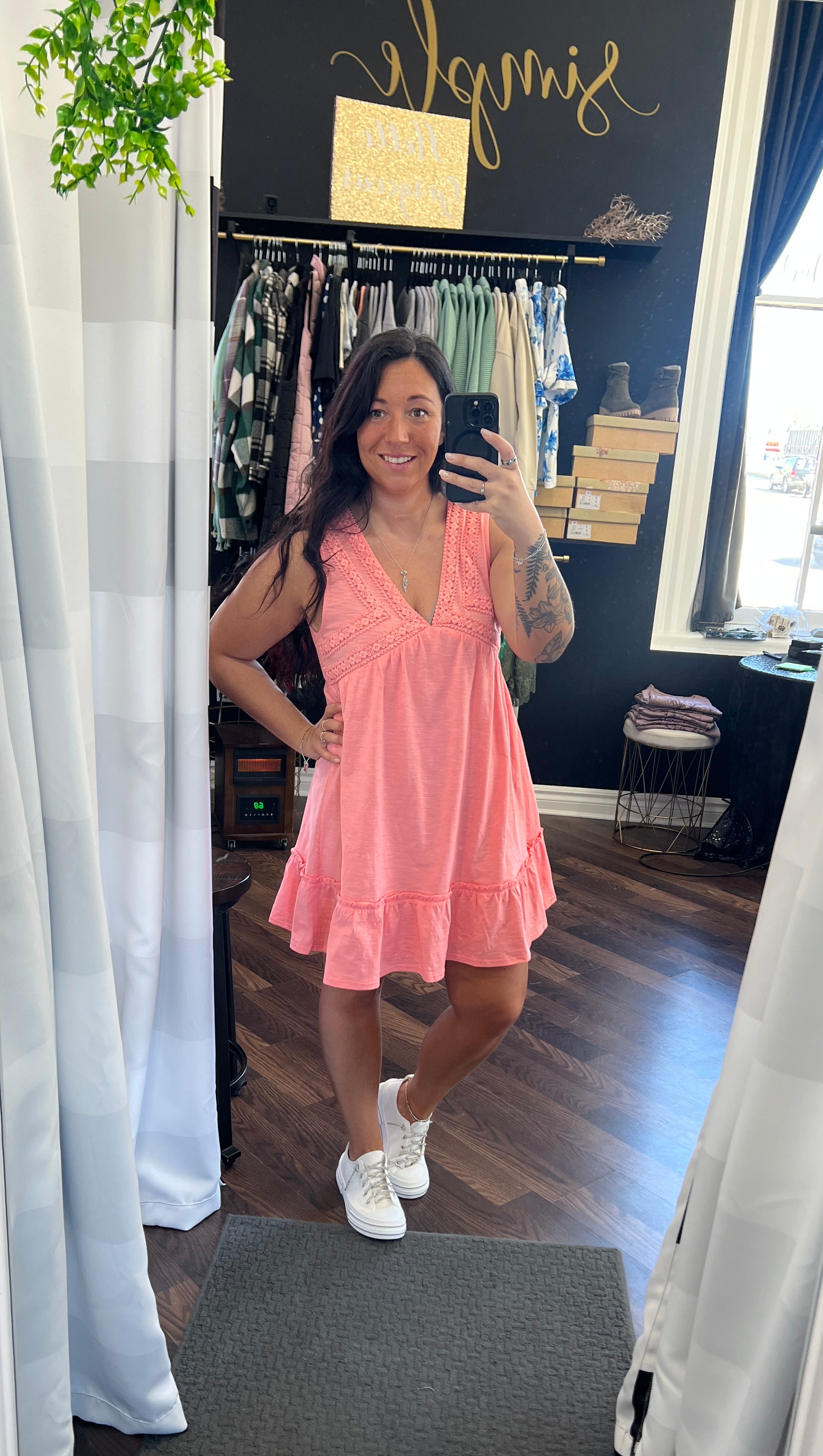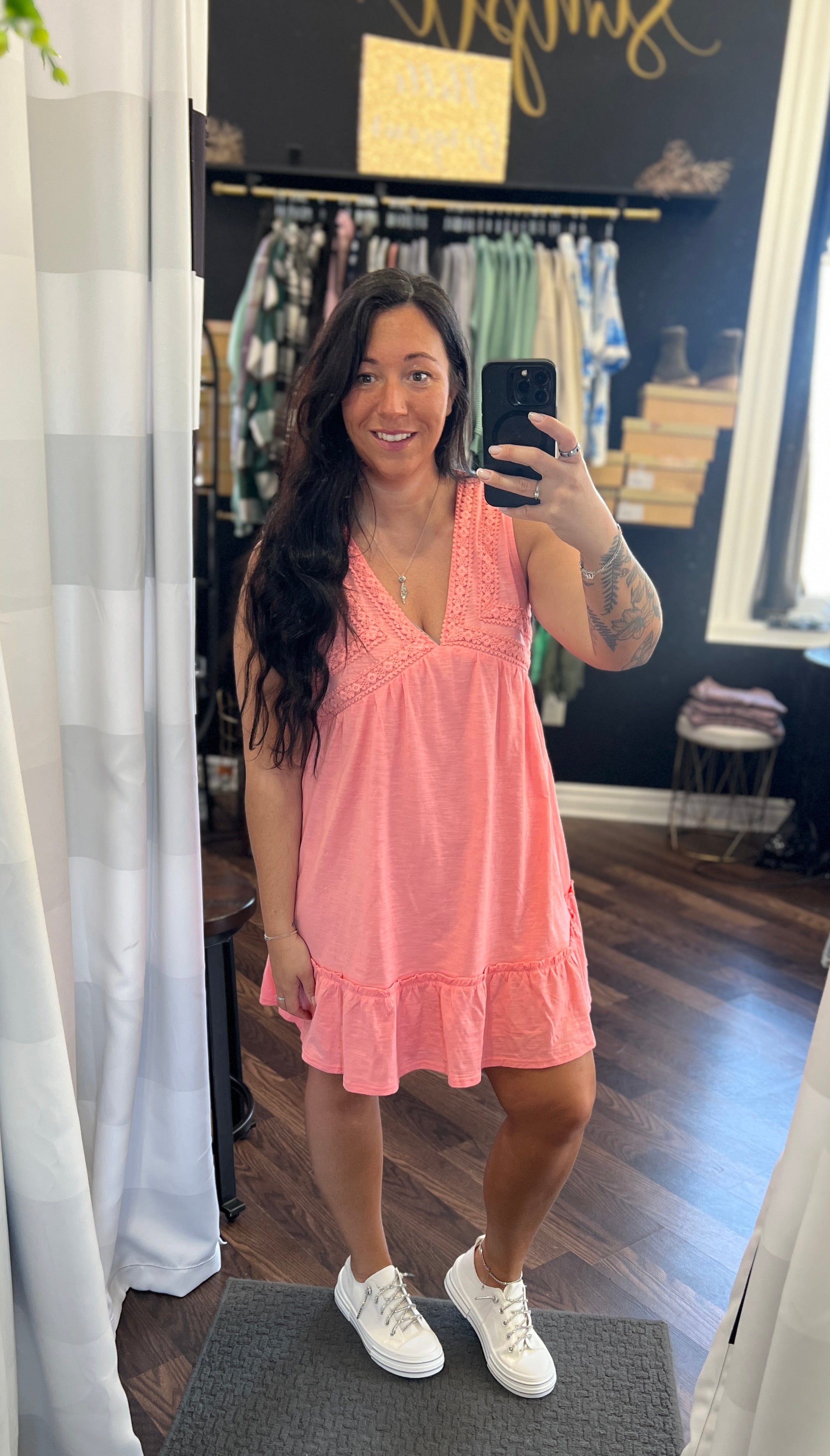 A cute sun dress that is easy to wear and lined! V-neck with a gorgeous crochet lace detail with a ruffle hem that lands just above the knee! Can also double as a bathing suit cover up! Dress it up with cute wedges or sandals, dress it down with our best-selling white sparkle lace tennies!
