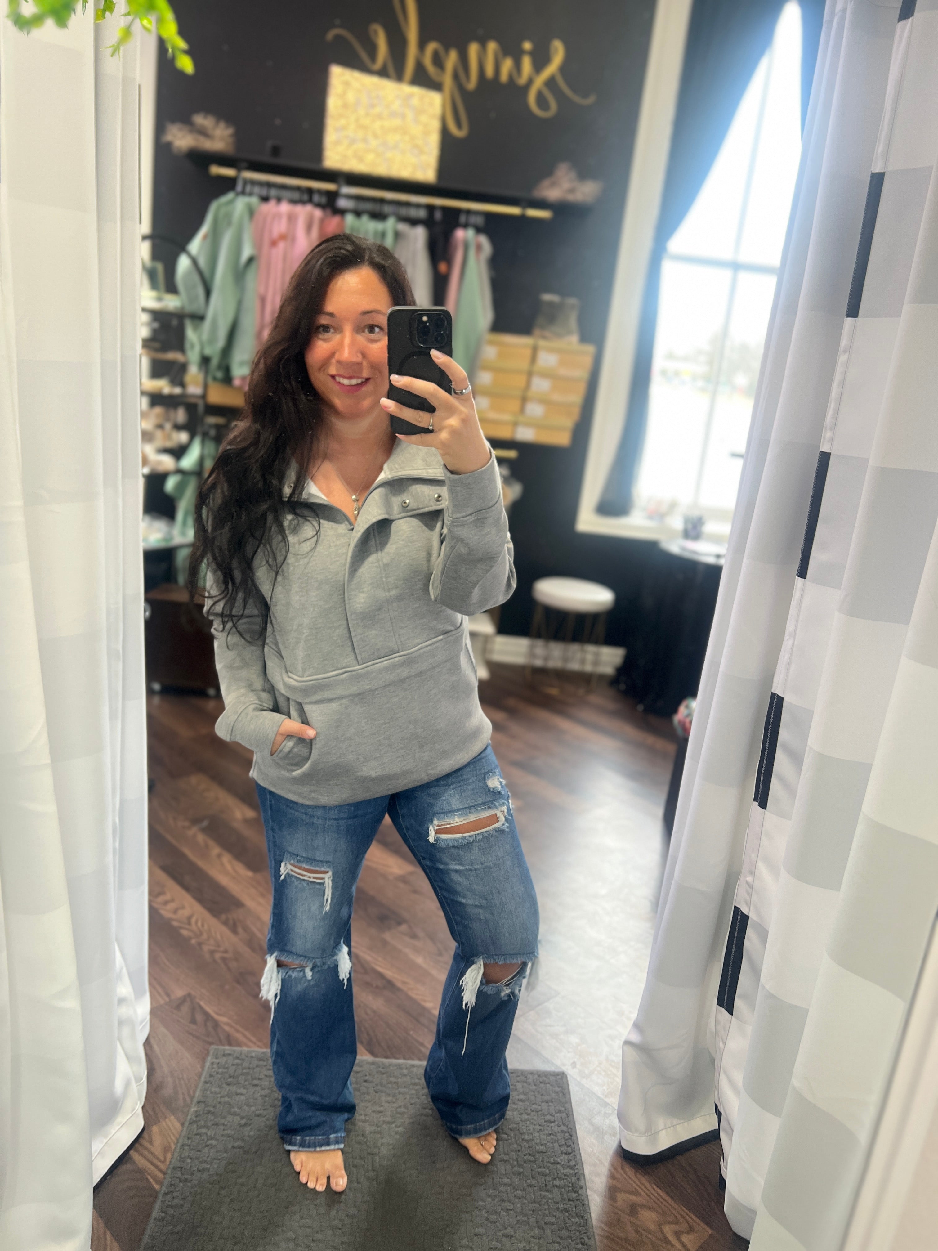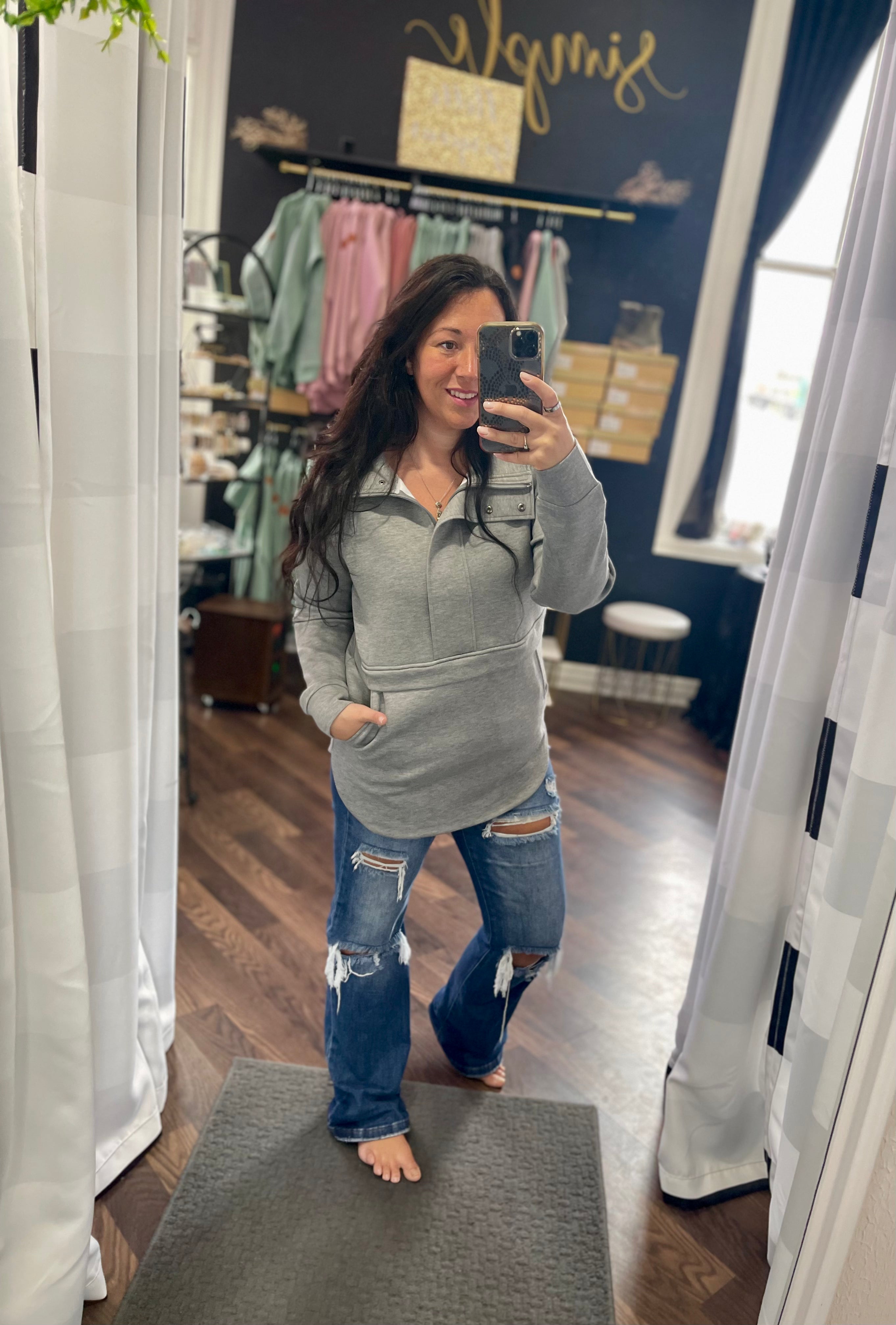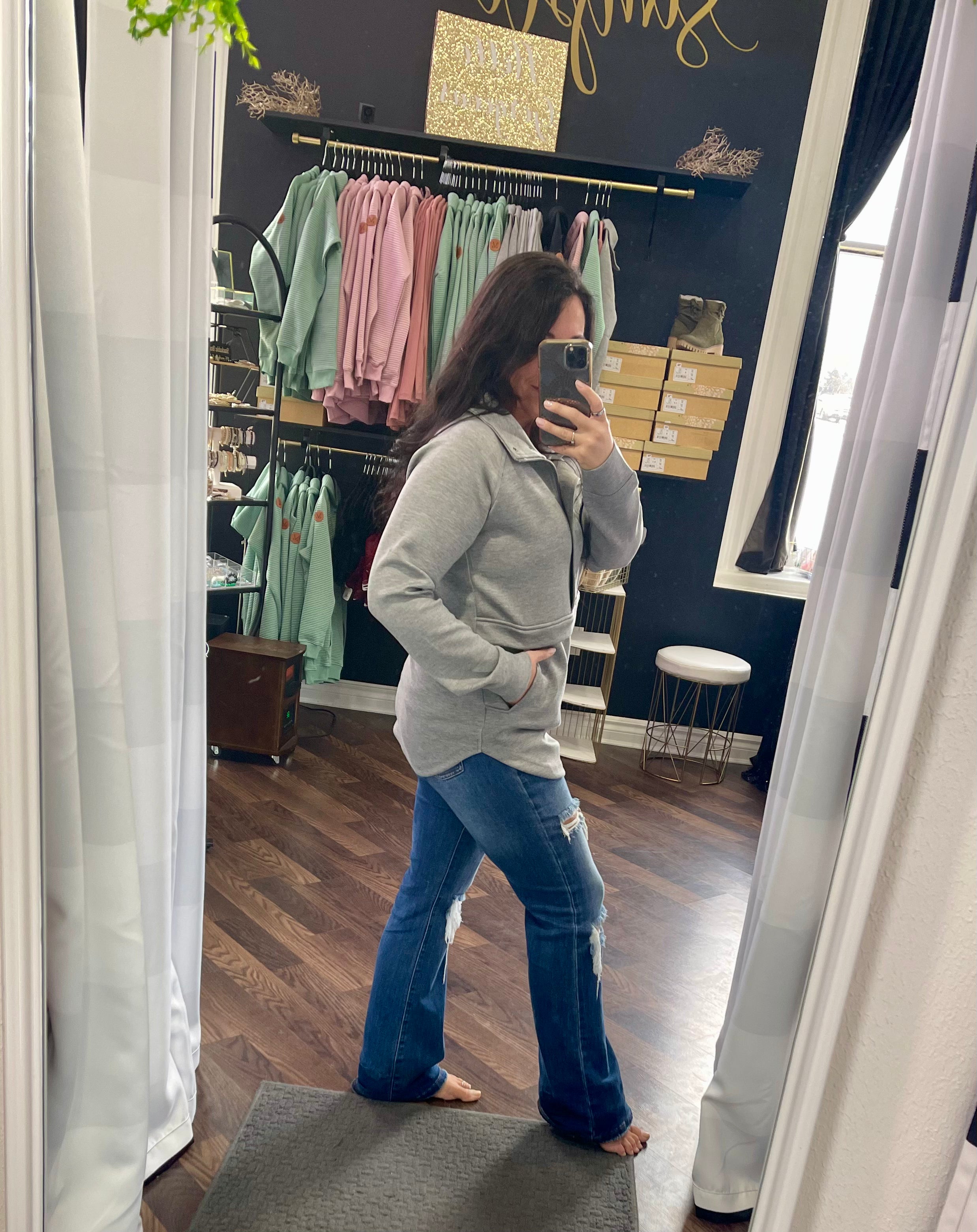 This grey half zip scuba pullover is incredible! Featuring our favorite rounded hem for a flattering fit, a super nice & comfy scuba fabric, two pockets, & half zip. Pair it with jeans or leggings.