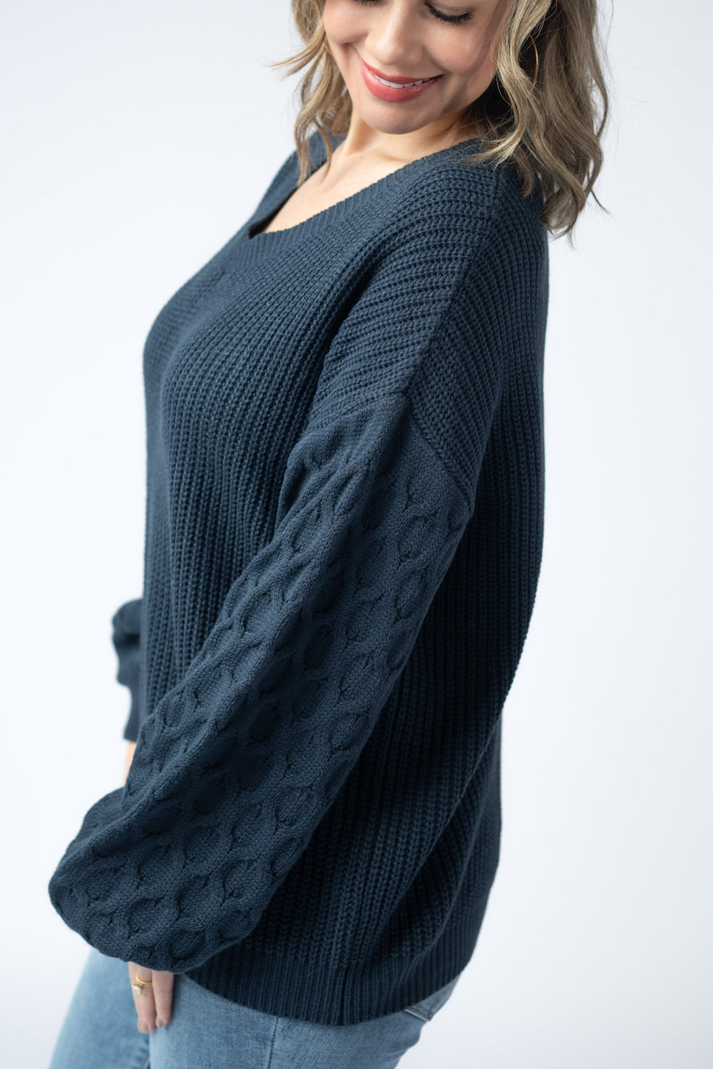 Get ready for chilly weather with the Navy Textured Sweater. Made with a mix of soft and cozy textured patterns, this V-neck sweater is perfect to stay warm and stylish all fall & winter! Meegan loves the v-neck and relaxed fit.