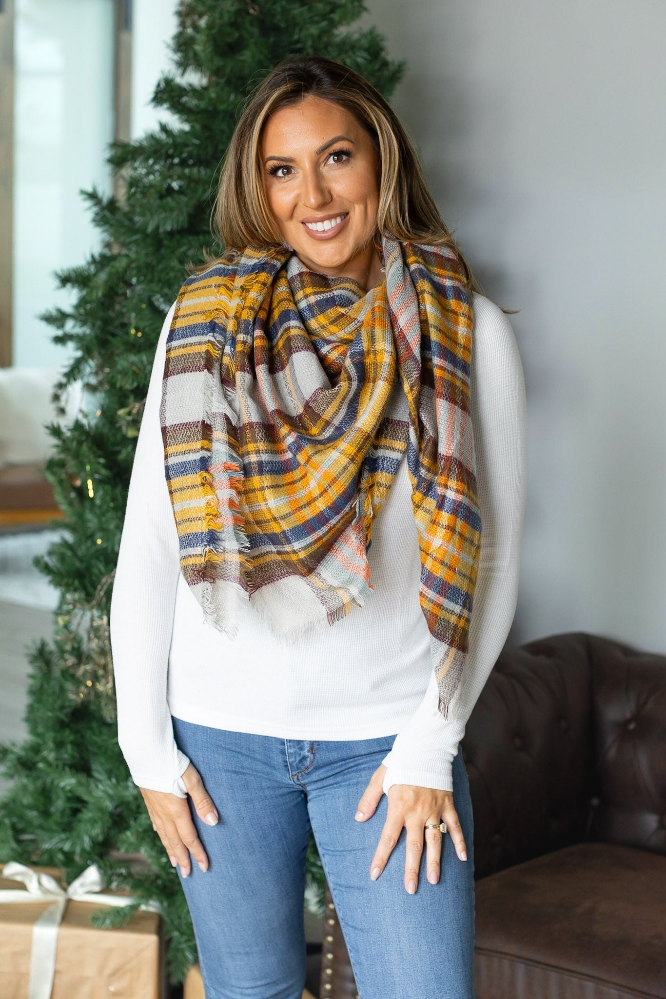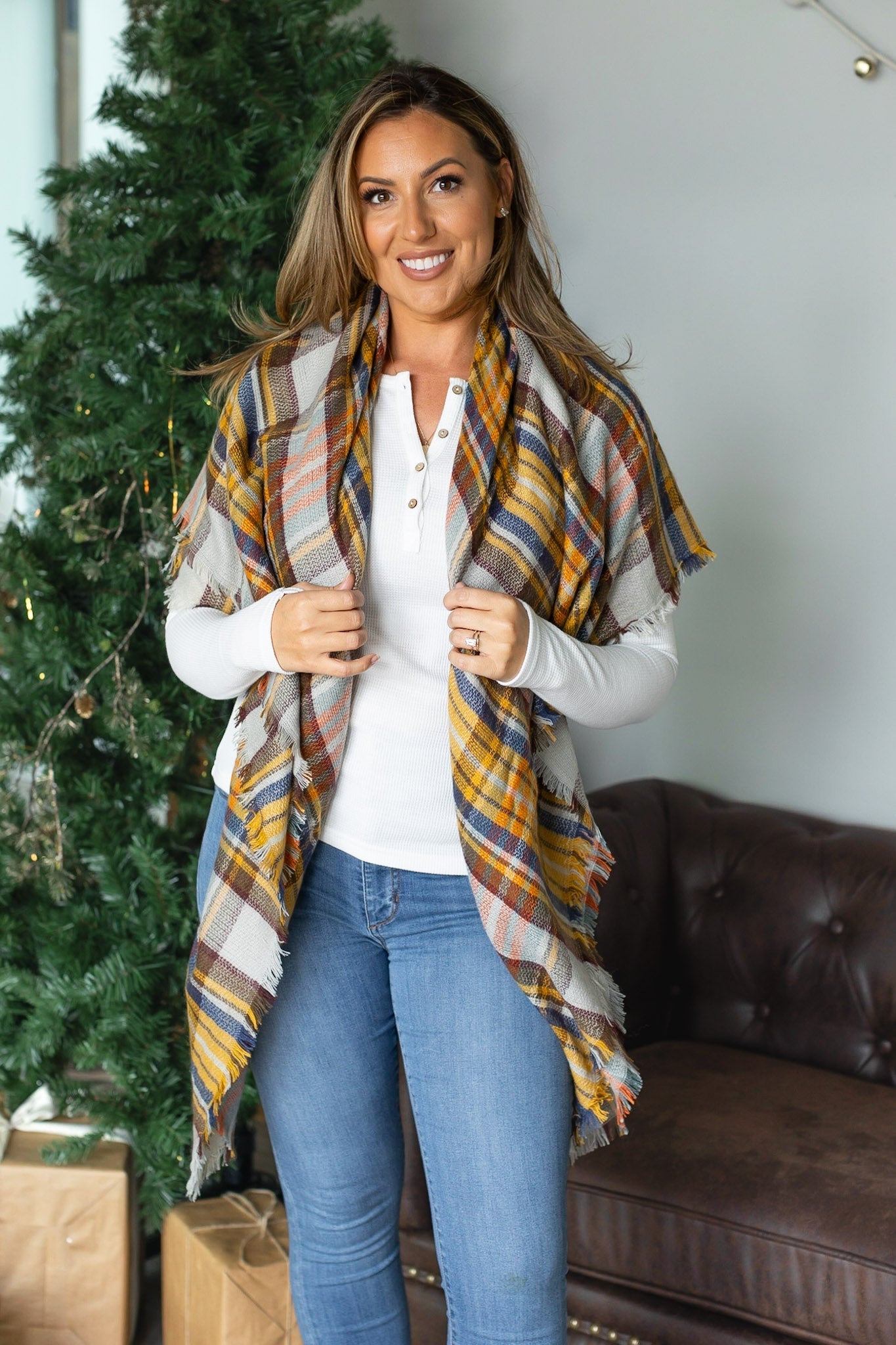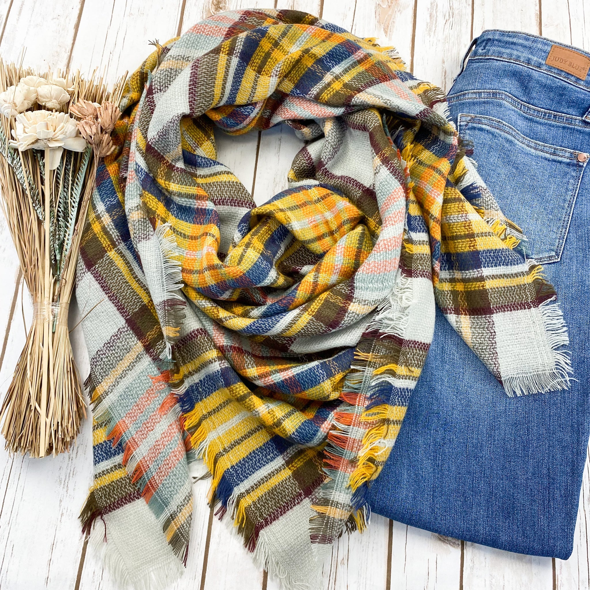 Our Caroline Blanket Scarf features a mustard & blue plaid. Perfect for chilly weather, this cozy scarf offers just the right amount of warmth and comfort while keeping you fashionable. Its versatile design allows for multiple styling options, making it a standout addition to your wardrobe.