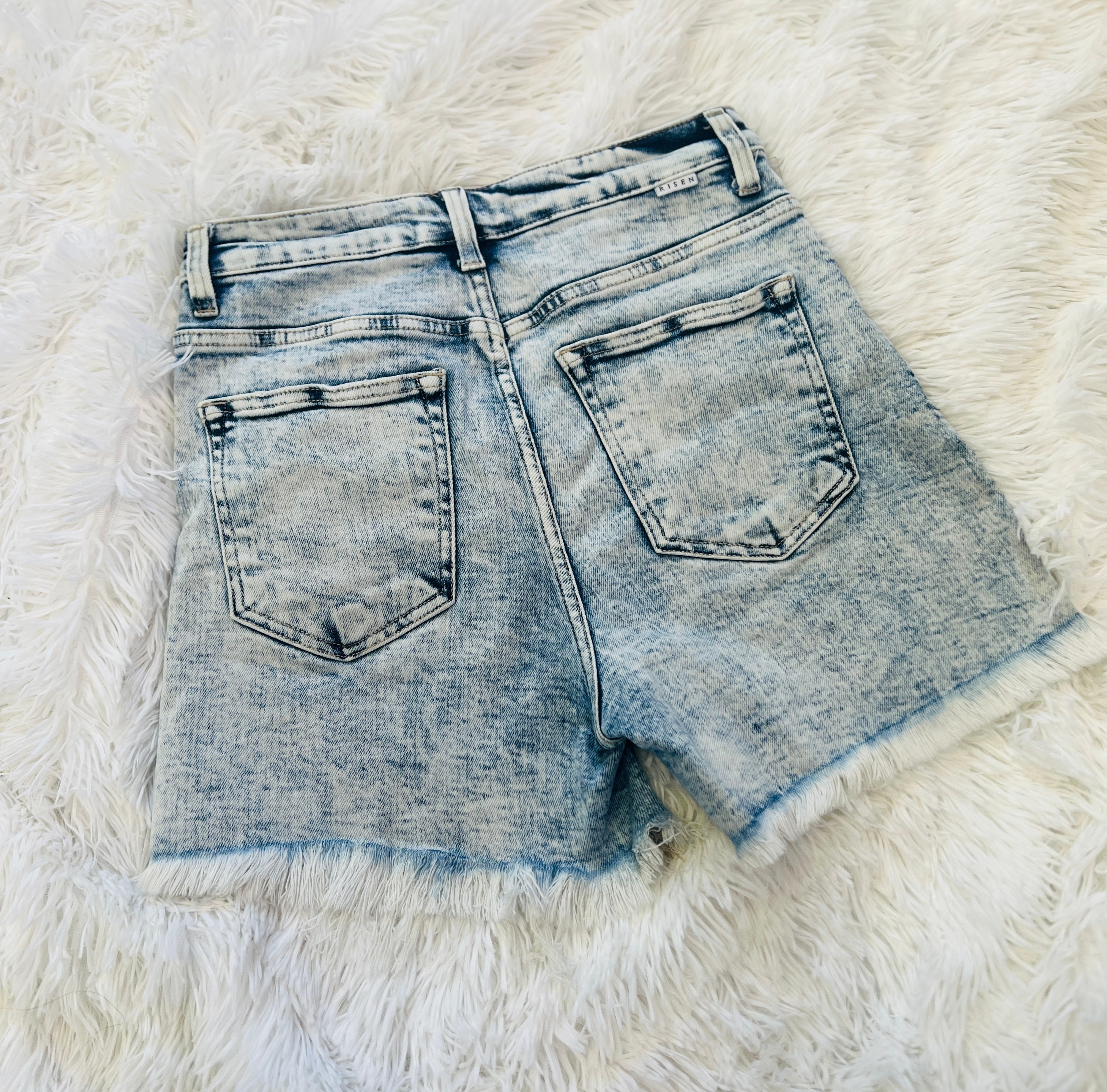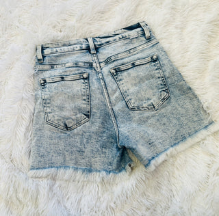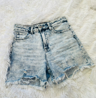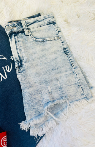 Comfortable acid wash denim shorts that have just the right amount of stretch. Offering an inseam that is great for the tall and short ladies and a high rise that holds you in comfortably! The frayed hem detail not only provides your thighs room to breathe but adds a fun touch.