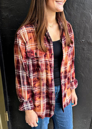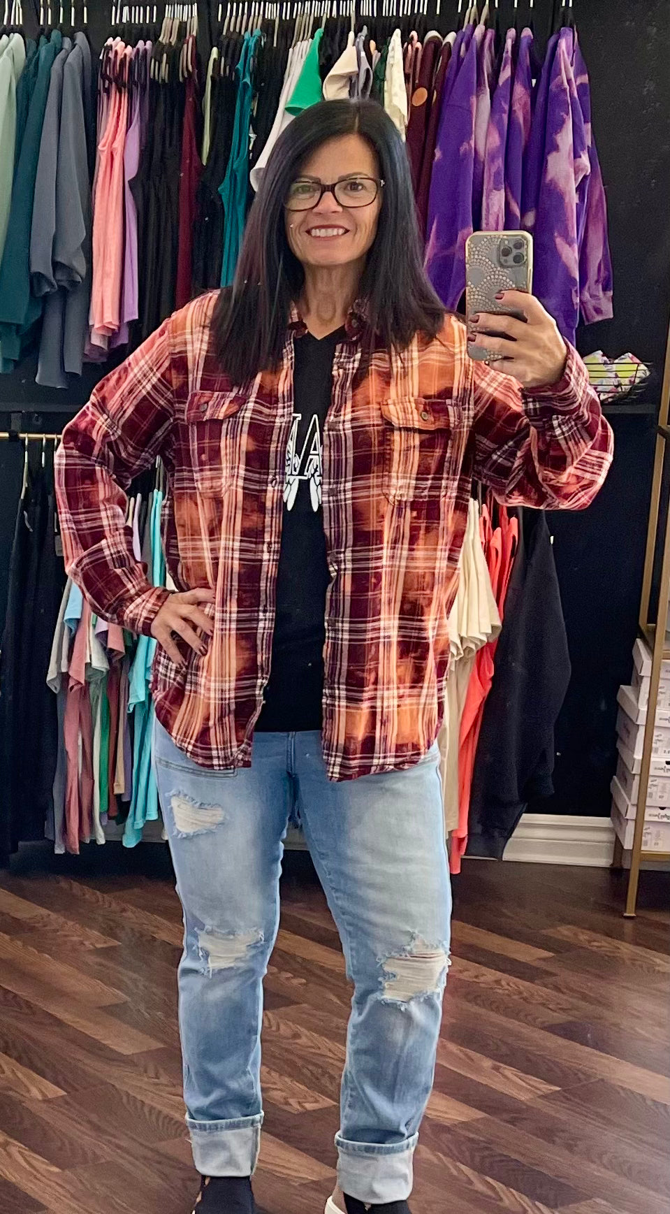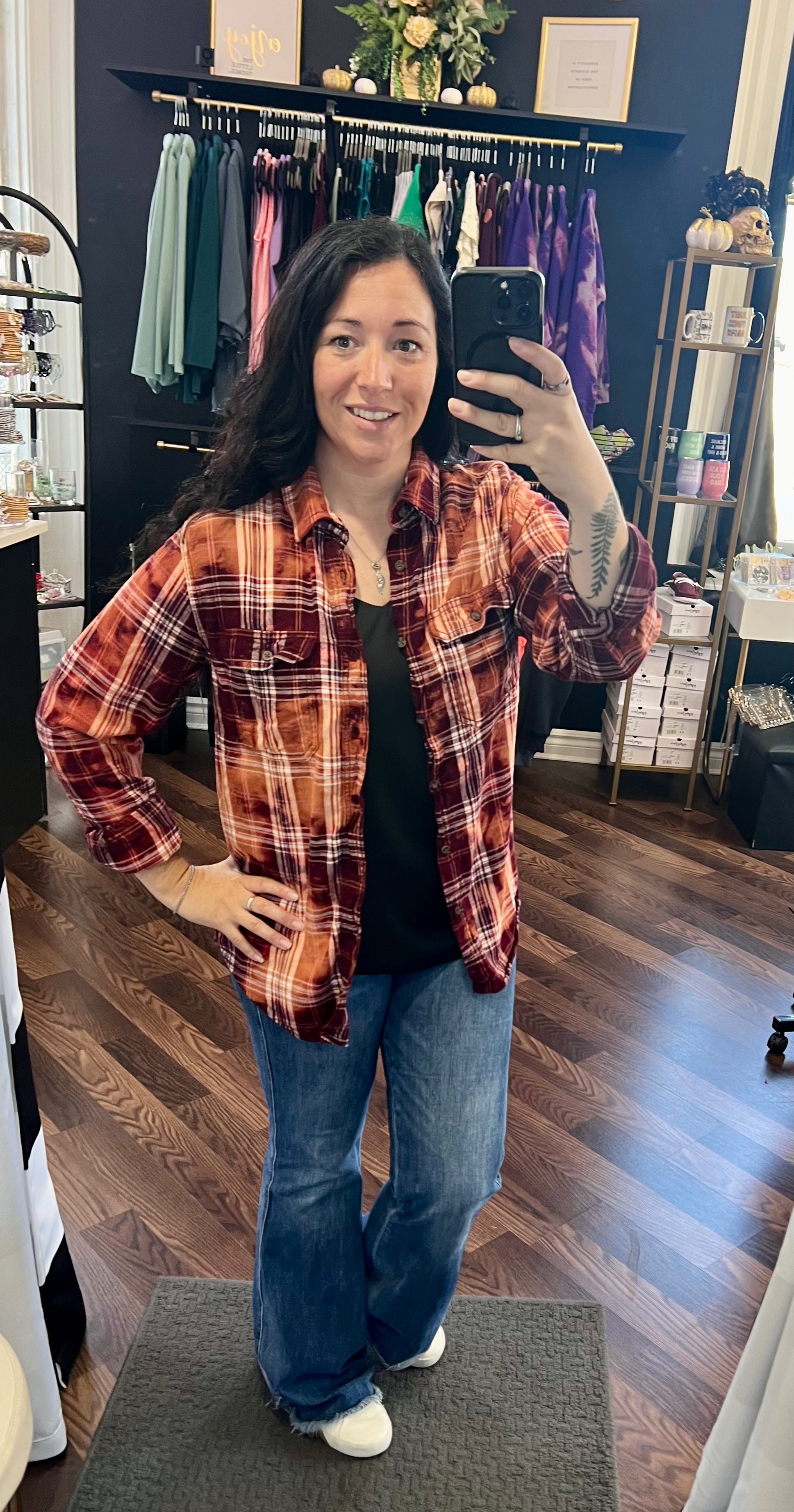 These flannels are the SOFTEST, hand distressed flannels around! I personally think they have the most flattering fit! Woman owned, designed and hand-distressed in the USA! Each flannel has a unique look, which I also love! Amazing relaxed fit. Wear them with a tank, over a tee, over a v-neck, with jeans, with leggings… soo many options! They are long enough if you want to pair with a tee and leggings, they cover your backside. The quality of these have always been amazing- it is the same company we have used for the distressed flannels every fall and winter since we have opened; 5 years ago! The quality is unmatched, my original ones are still holding up just like new!